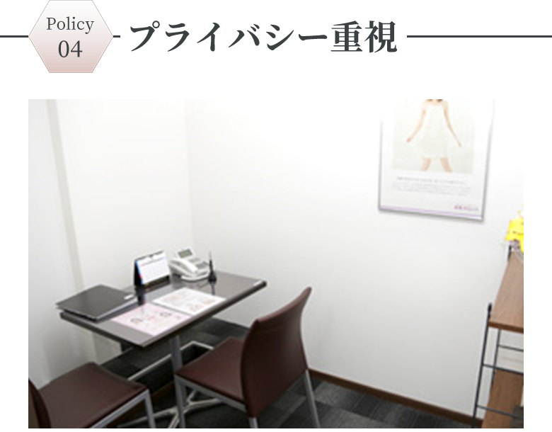 待合室は半個室で、カウンセリング時にはプライバシーに配慮した完全個室で対応いたします。 ドクター診察も移動することなく個室でお待ちいただきます。